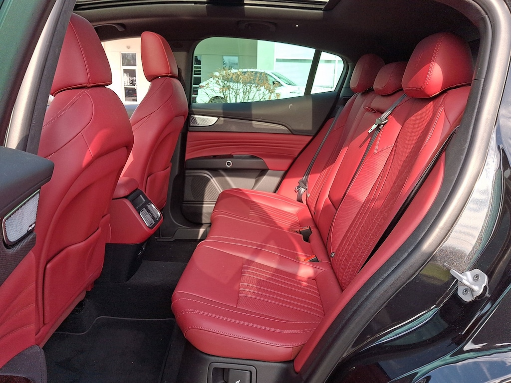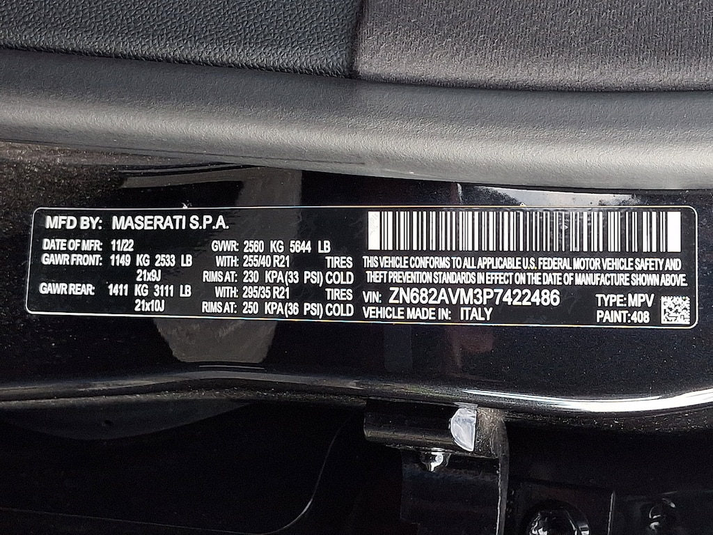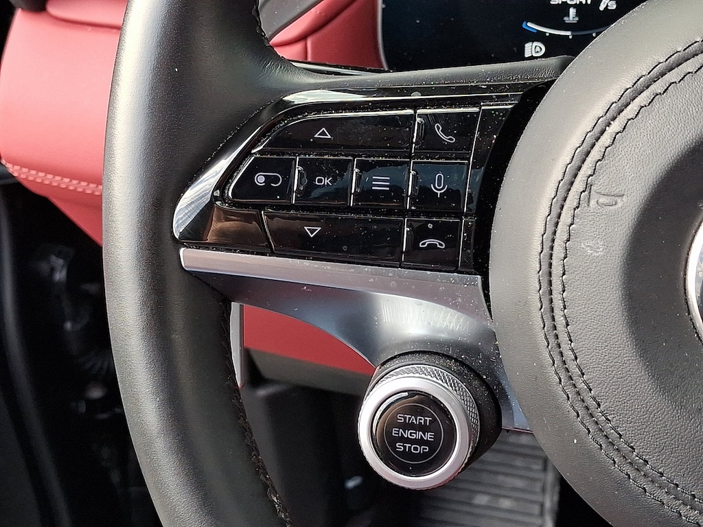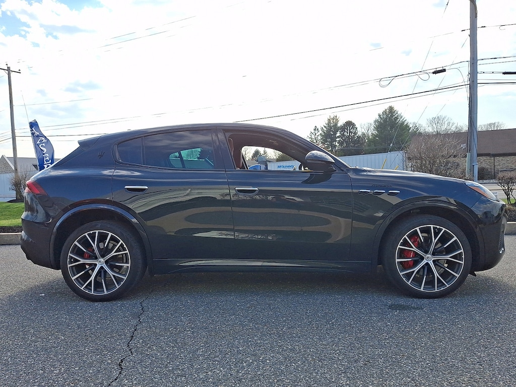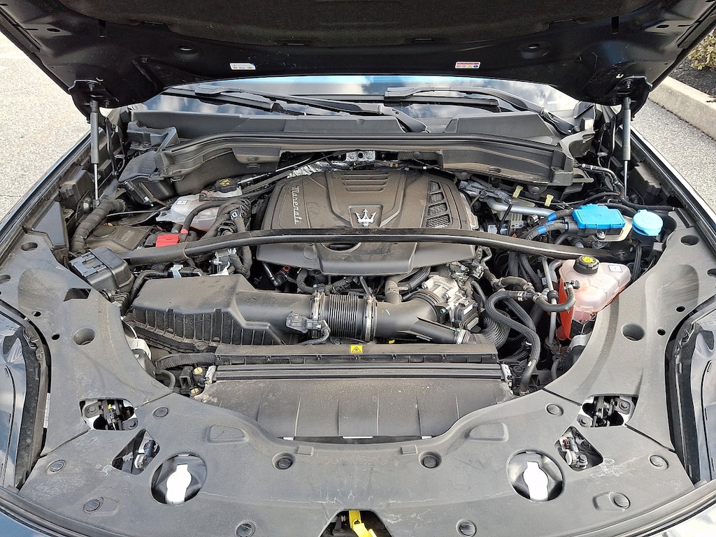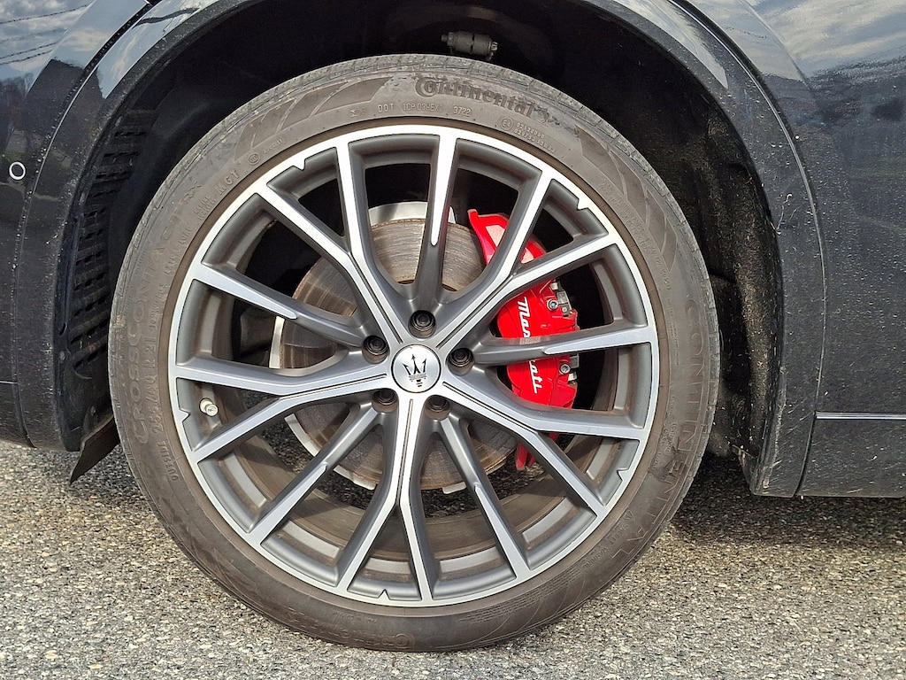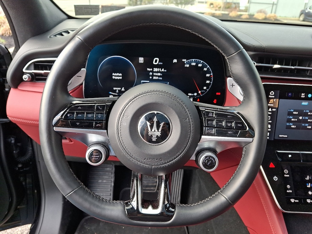 It features 14-Way Ventilated Power Front Sport Seats, 3D Matte Carbon Fiber Weave Trim, 4-Wheel Disc Brakes, ABS brakes, Active Cruise Control, Active Driving Assist, Adaptive Cruise Control w/Stop & Go, Adaptive Full LED Matrix Headlamps, Adaptive suspension, Air Conditioning, AM/FM radio: SiriusXM, Apple CarPlay/Android Auto, Auto High-beam Headlights, Auto-dimming Rear-View mirror, Automatic temperature control, Brake assist, Driver Assistance Plus Package, Driver door bin, Driver vanity mirror, Dual front impact airbags, Dual front side impact airbags, Electronic Stability Control, Emergency communication system: Maserati Connect, Exterior Parking Camera Rear, Four wheel independent suspension, Front anti-roll bar, Front Bucket Seats, Front Center Armrest, Front dual zone A/C, Front reading lights, Full Premium Leather Seat Upholstery, Garage door transmitter: HomeLink, Genuine wood console insert, Genuine wood door panel insert, Gloss Red Painted Brake Calipers, Heated front seats, Heated Steering Wheel, Heated Windshield Washer Nozzles, Leather Seat Upholstery, Leather steering wheel, Low tire pressure warning, Memory seat, Modena Premium Package, Nero Tempesta - Metallic Paint, Occupant sensing airbag, Outside temperature display, Overhead airbag, Power driver seat, Power Liftgate, Power moonroof, Power passenger seat, Power steering, Power windows, Radio data system, Radio: High Premium Sonus Faber Audio System, Radio: Sonus Faber 860 Watts Premium Audio System, Rain sensing wipers, Rear anti-roll bar, Rear window defroster, Remote keyless entry, Security system, Speed control, Speed-sensing steering, Split folding rear seat, Steering wheel memory, Steering wheel mounted audio controls, Traction control, Traffic Sign Information, Trip computer, Voltmeter, and Wheels: 21" Matte Crio Staggered.